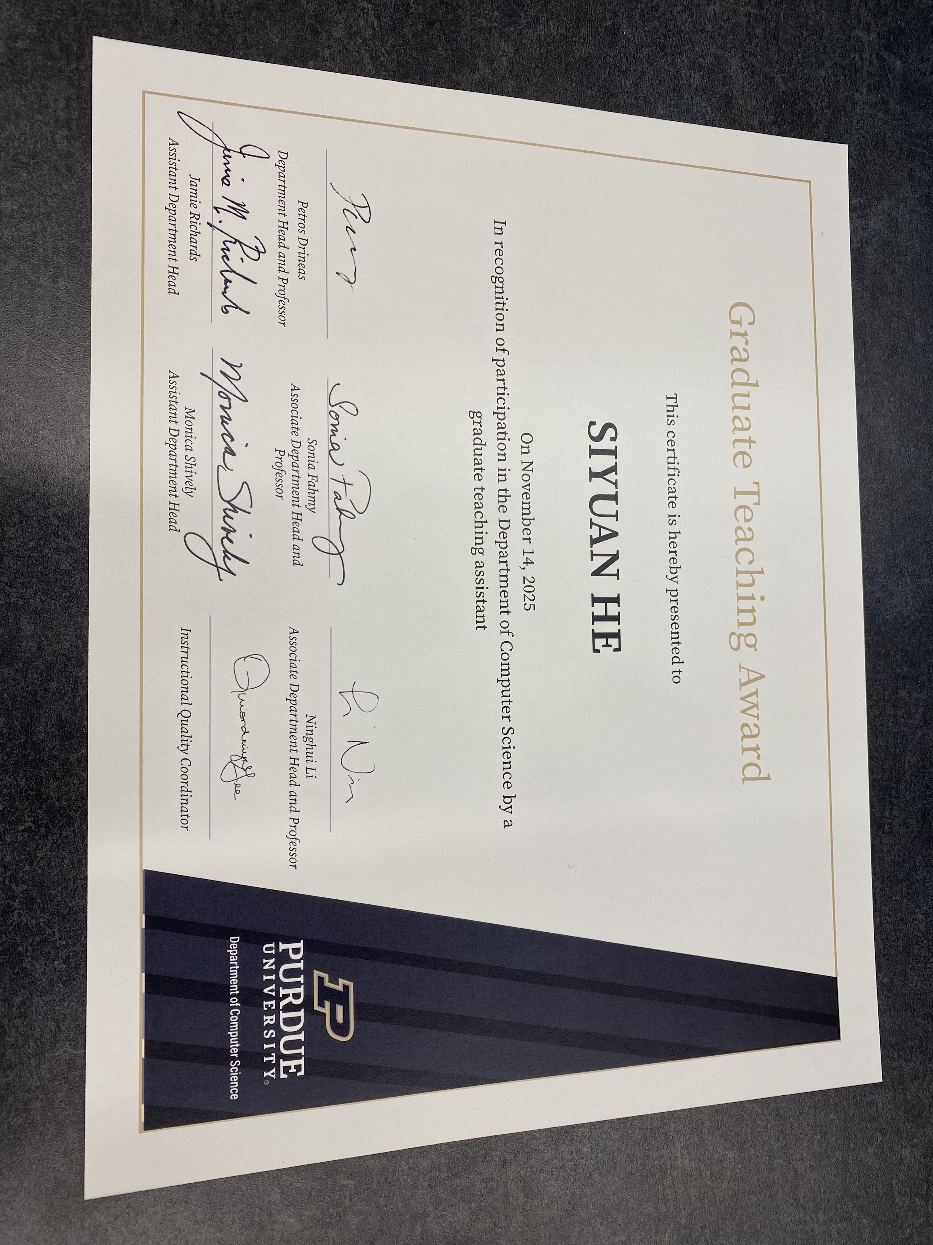 - Fall 2025:Graduate Teaching Award (for CS240)